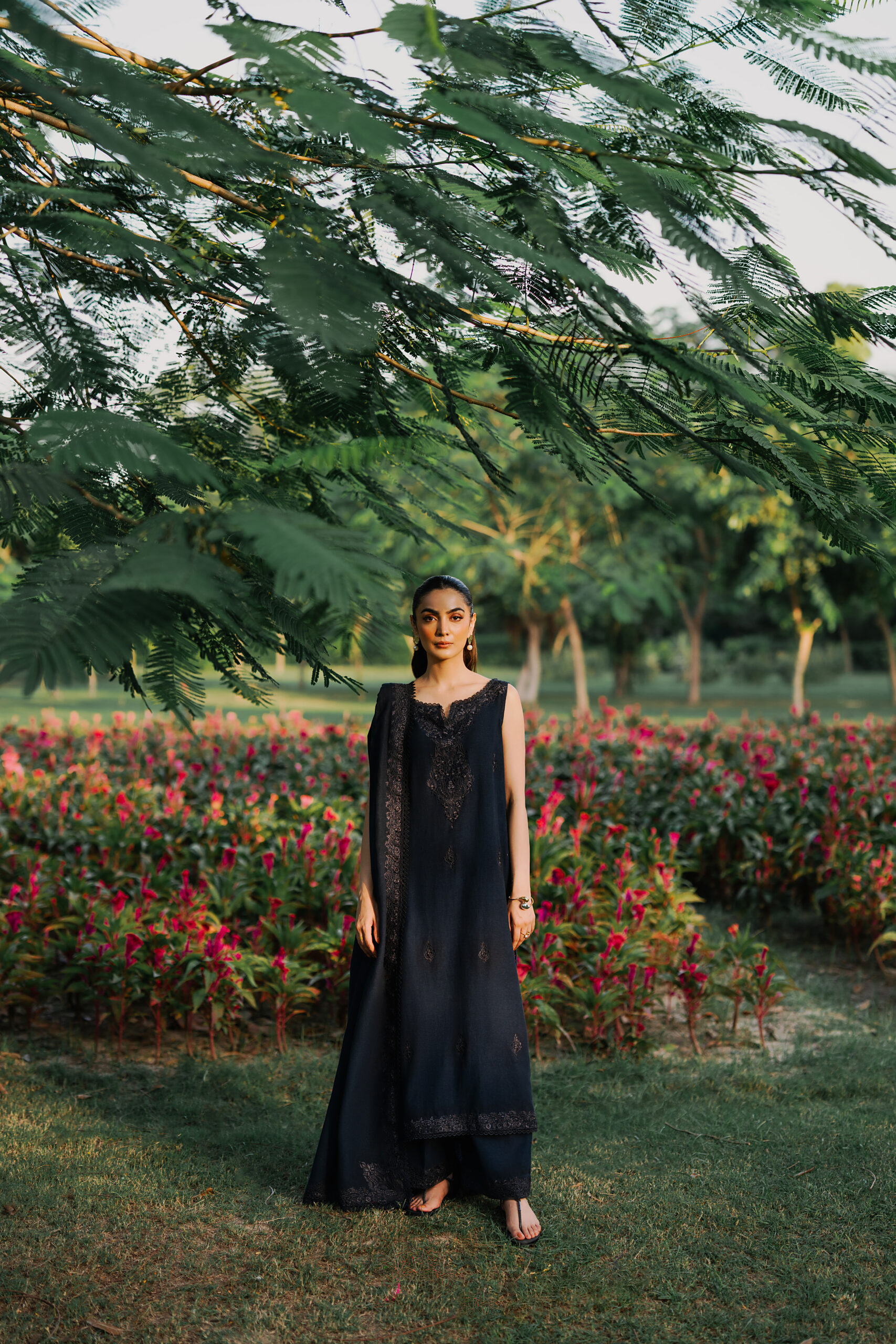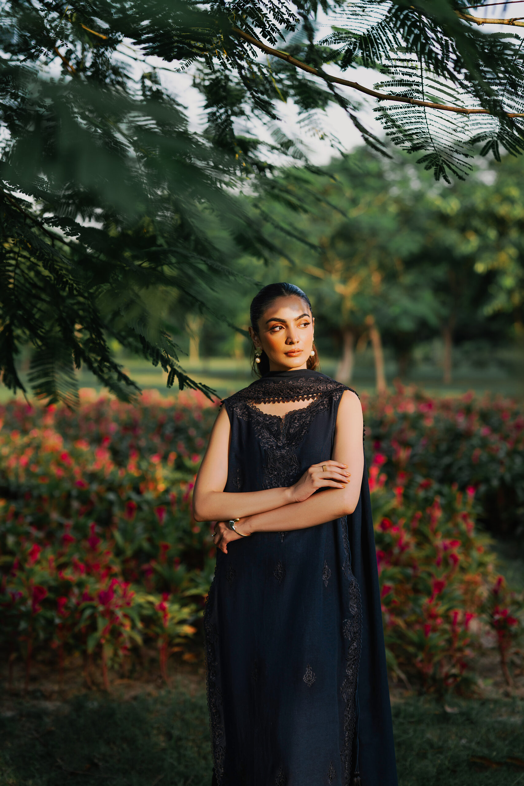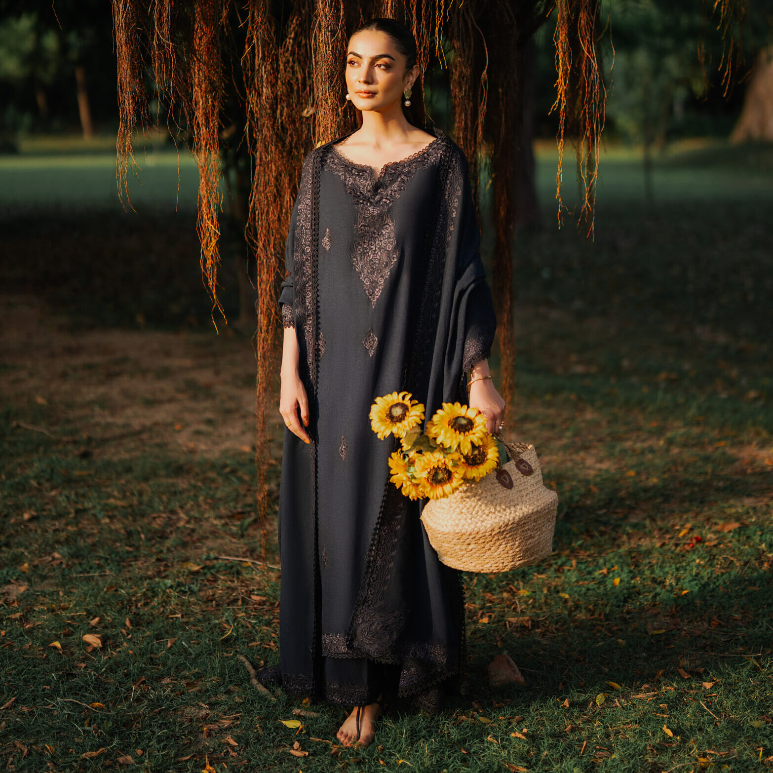 This modern three-piece dress features delicate navy blue tone-on-tone embroidery on the neckline, body, and hem borders. The outfit is completed with a matching embroidered dupatta and trousers. The threadwork blends beautifully with the fabric, creating a luxurious and elegant look.