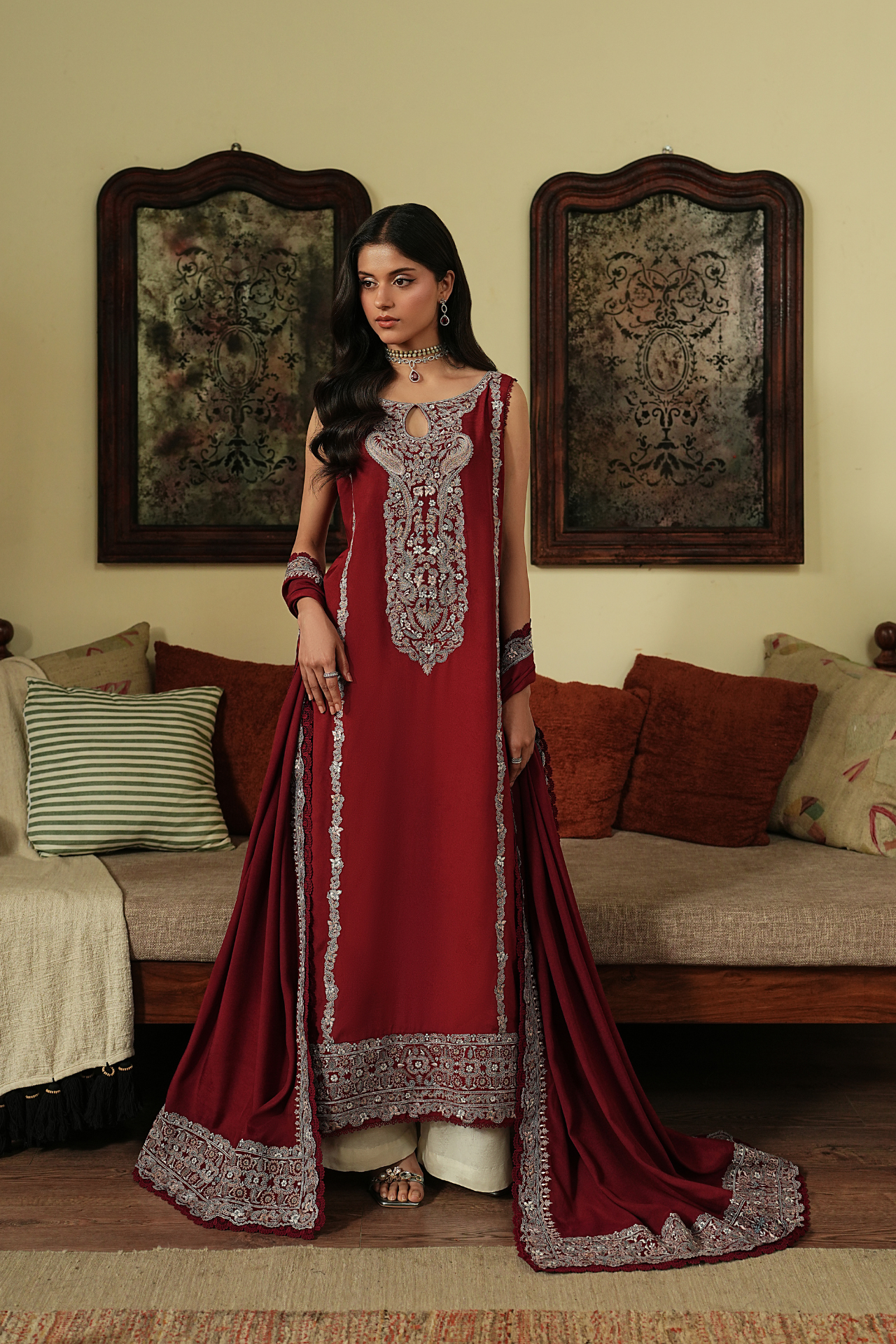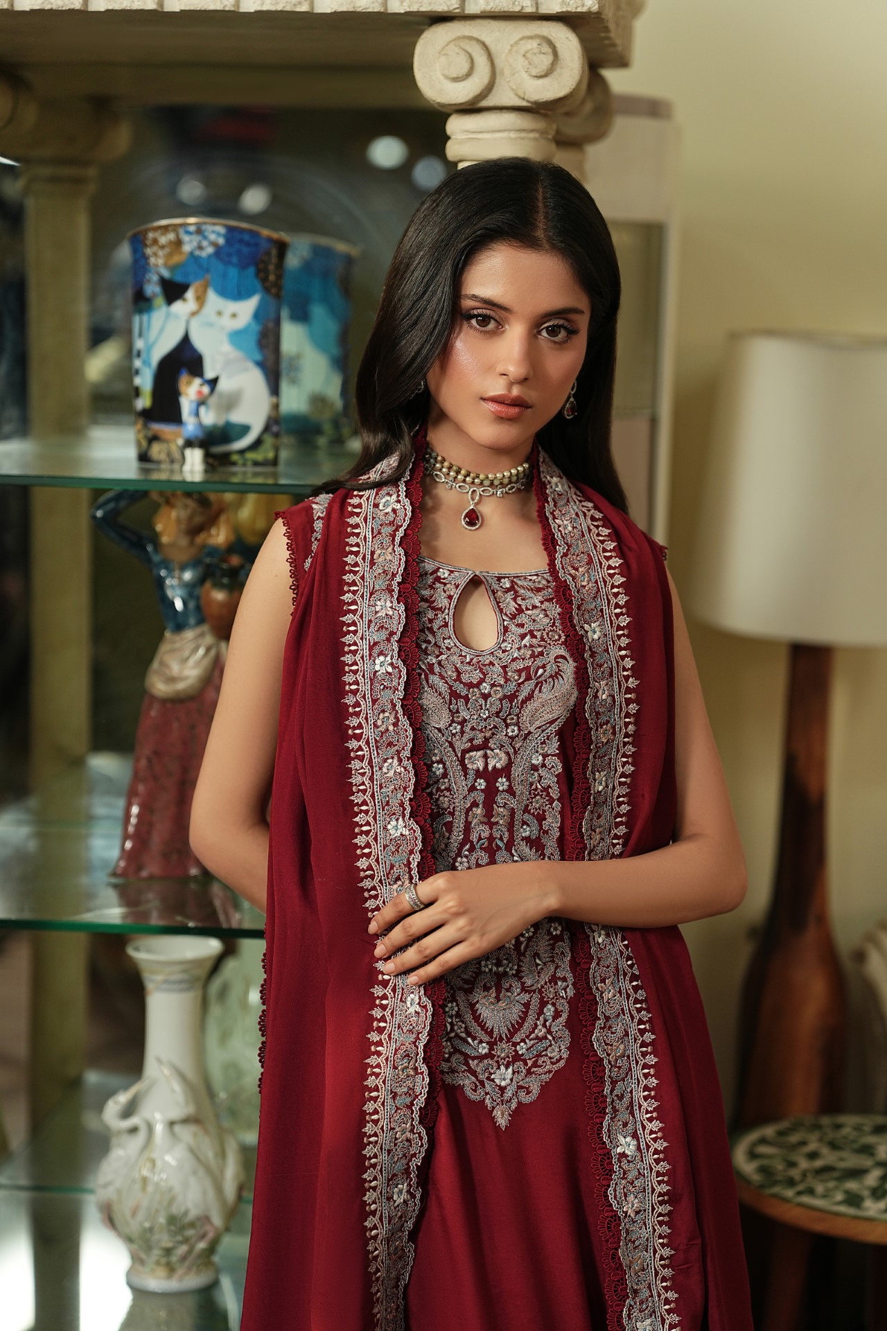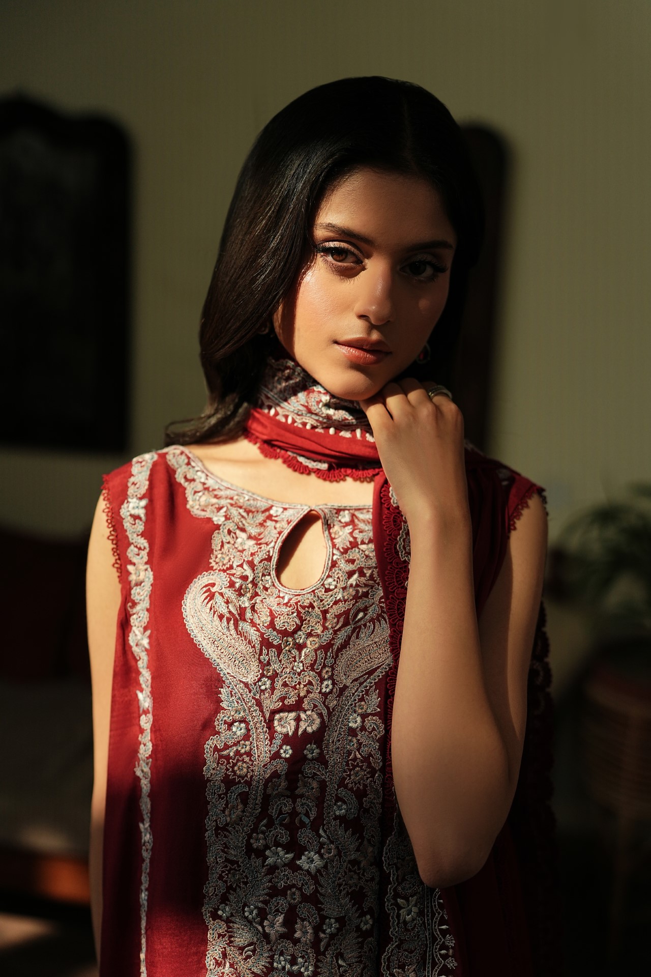“Crimson” brings a rich and deep tone. The embroidery is thoughtfully designed with soft hints of beige white and subtle blue, adding a beautiful contrast against the maroon base. These gentle color accents enhance the detailing and give the outfit dimension without overpowering the main shade. The combination of colors makes the embroidery stand out.