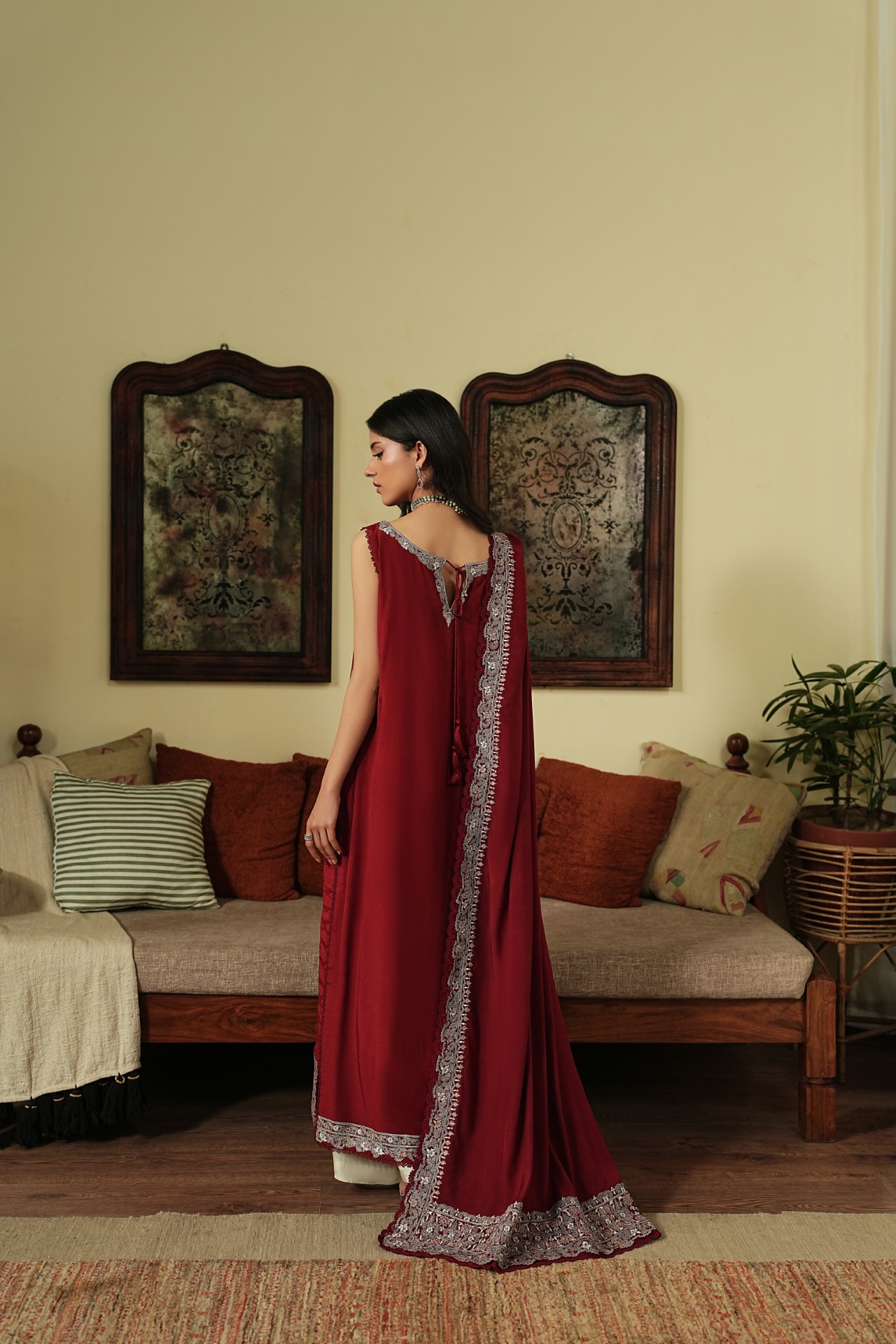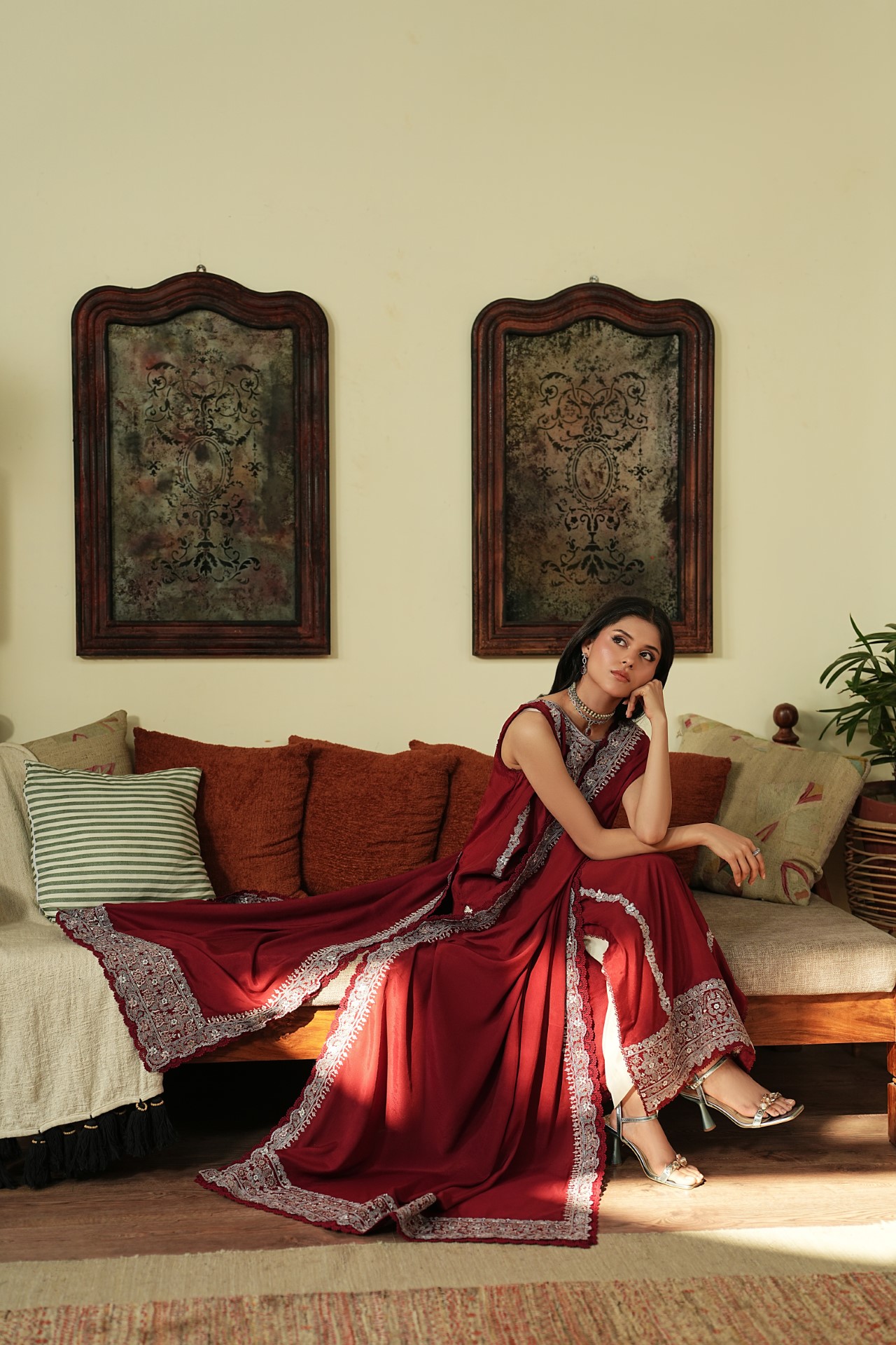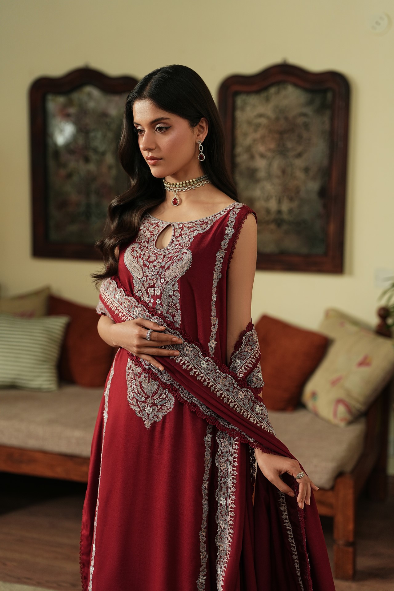 “Crimson” brings a rich and deep tone. The embroidery is thoughtfully designed with soft hints of beige white and subtle blue, adding a beautiful contrast against the maroon base. These gentle color accents enhance the detailing and give the outfit dimension without overpowering the main shade. The combination of colors makes the embroidery stand out.