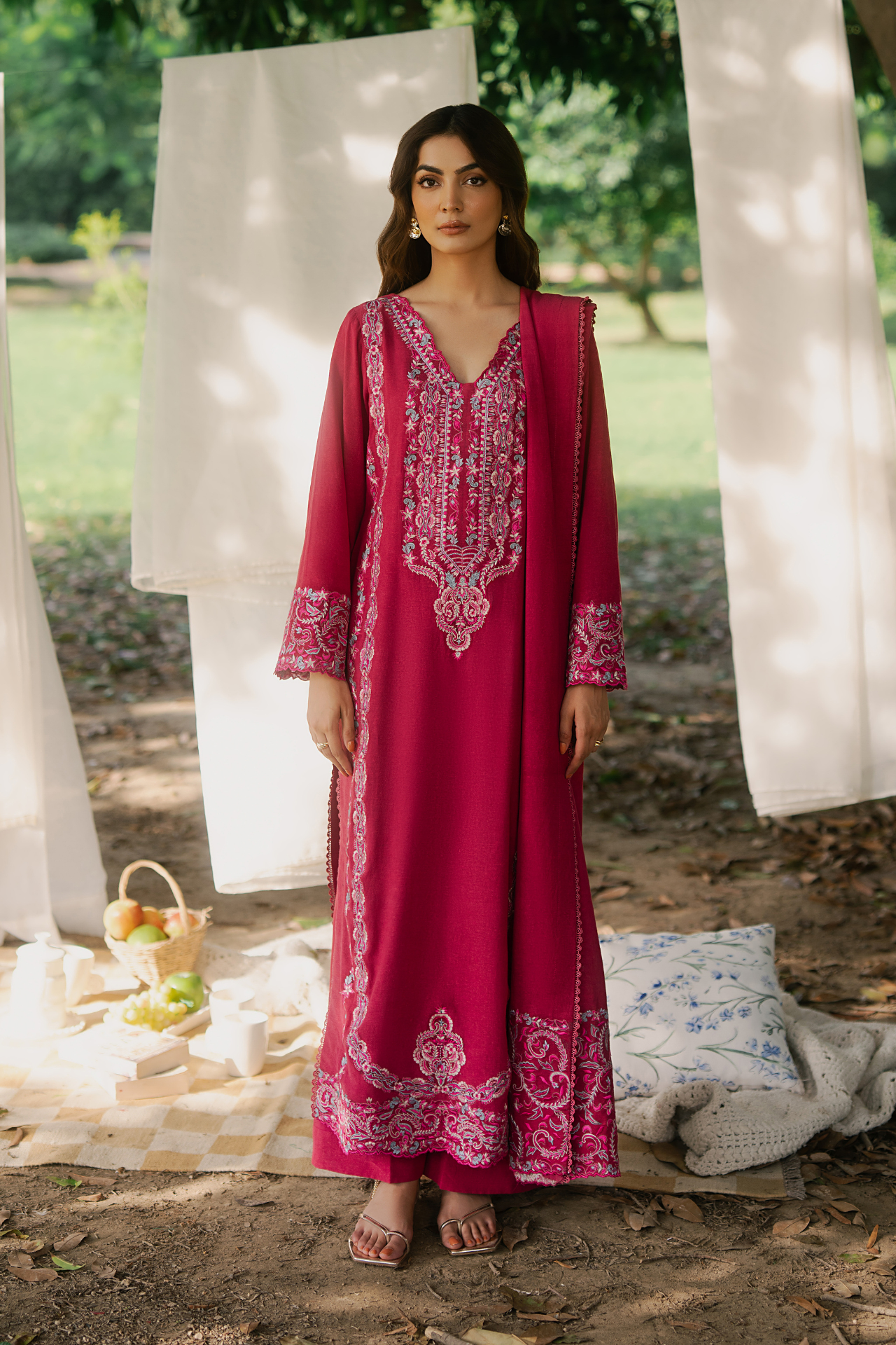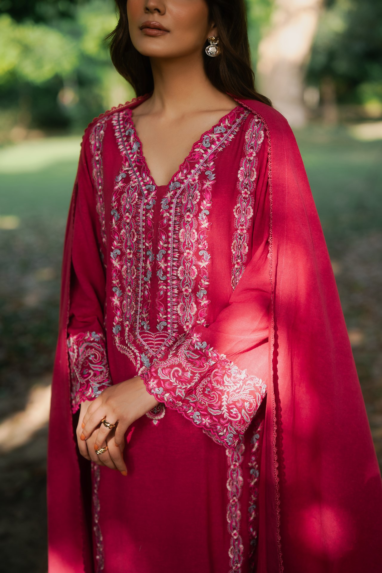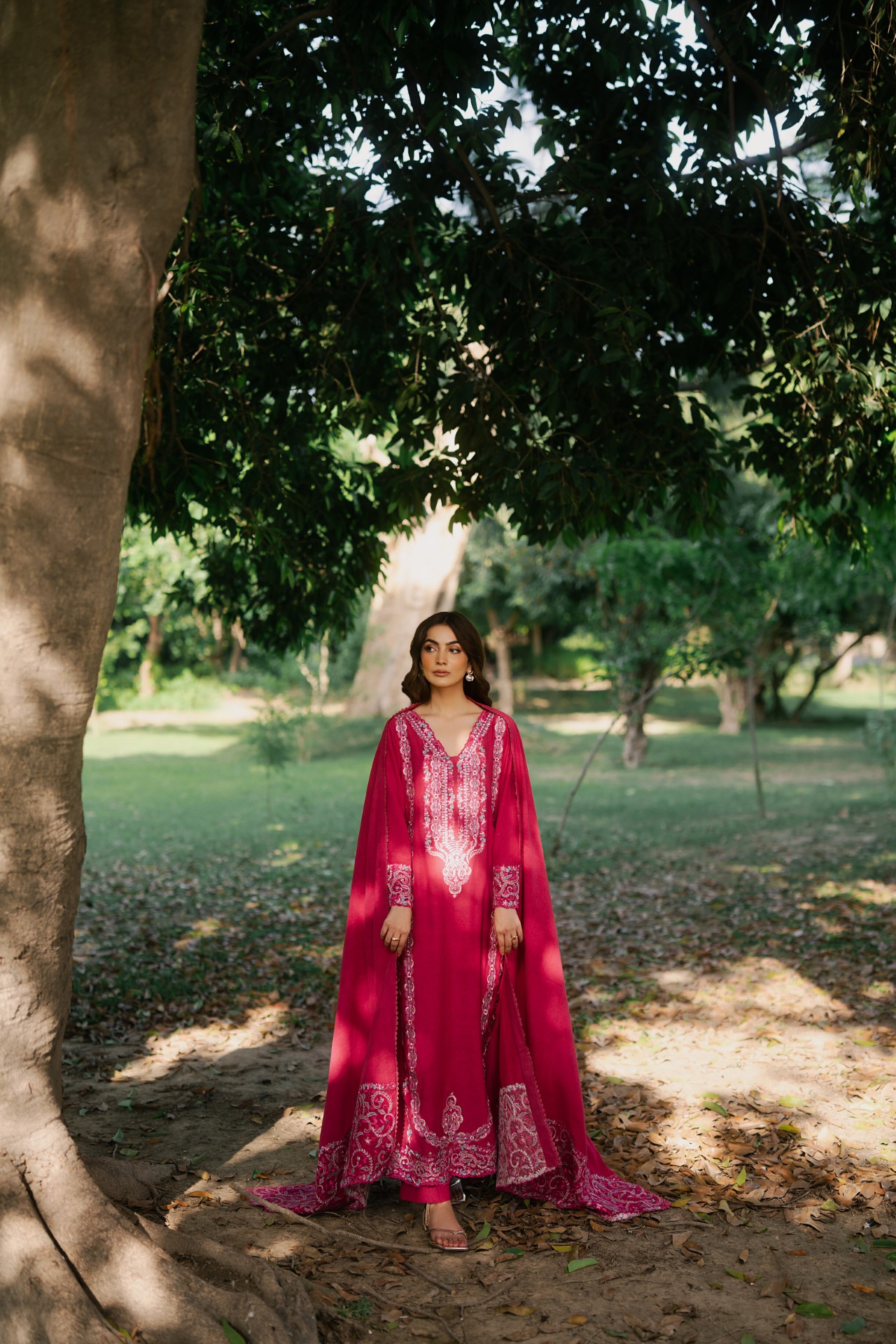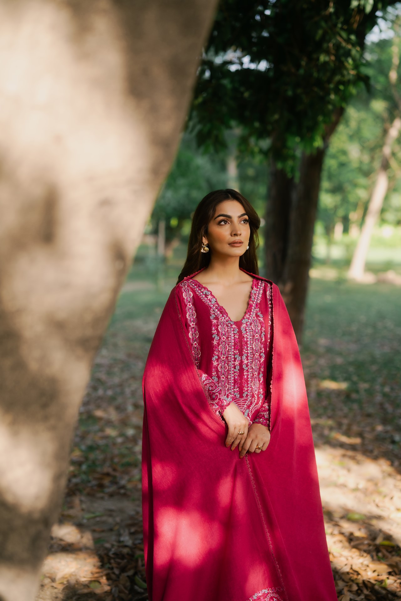 This elegant fuchsia pink dress is made from soft karandi fabric, perfect for the winter season. It features delicate embroidery on the neckline, sleeves, vertically down the body and borders. The flowy cut gives it a graceful look, making it ideal for daytime events, get-togethers, or festive evenings.