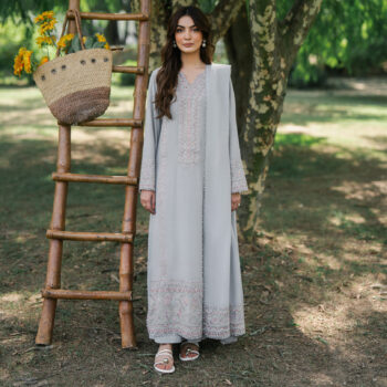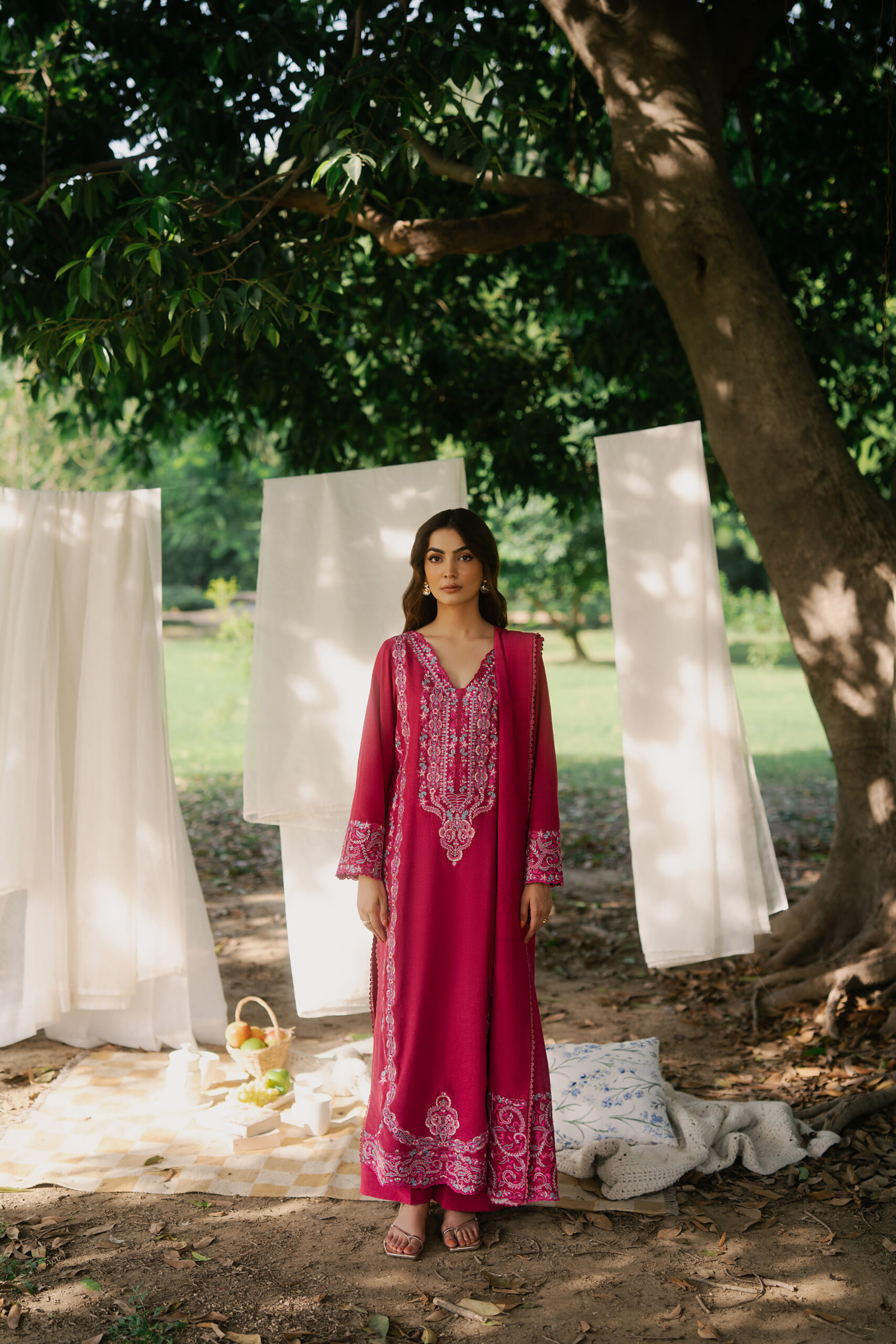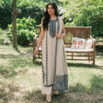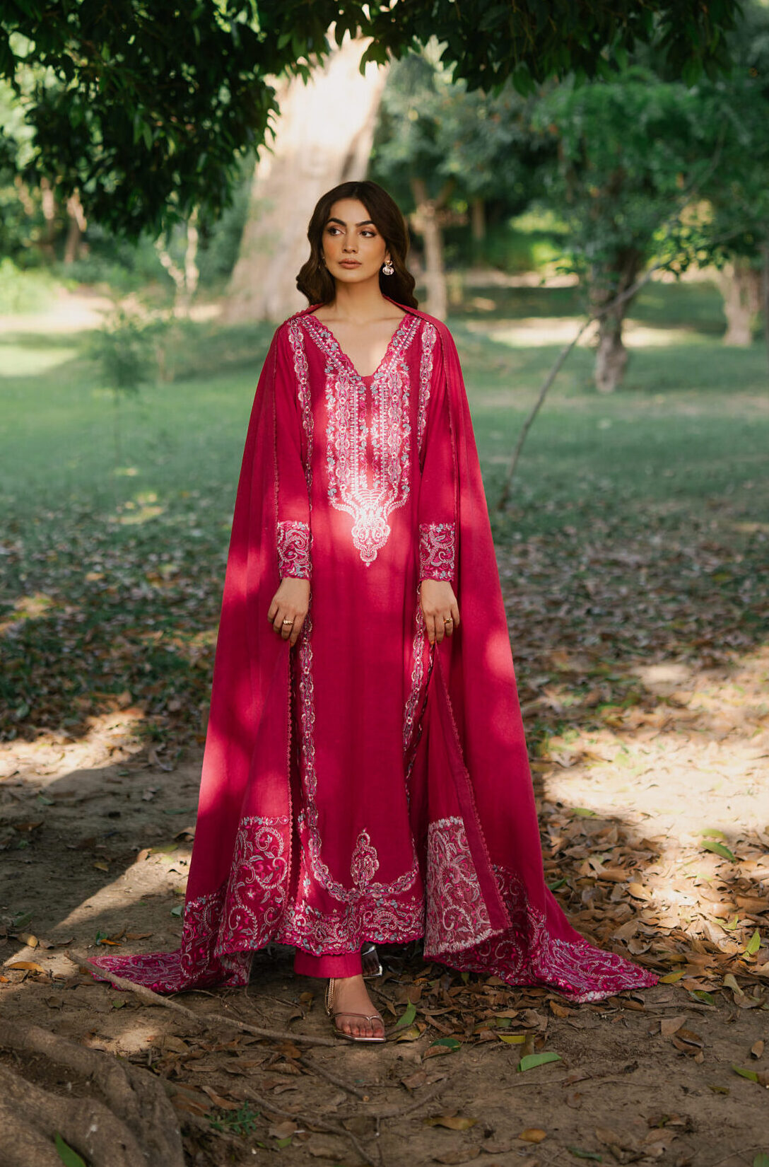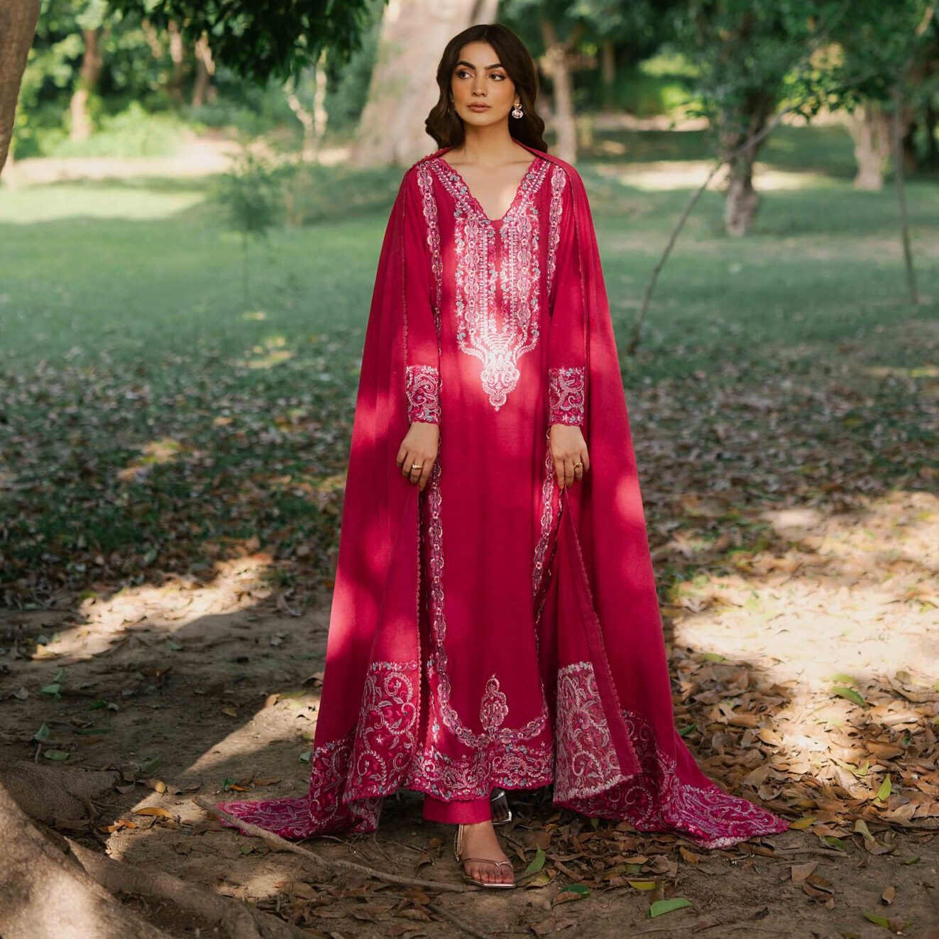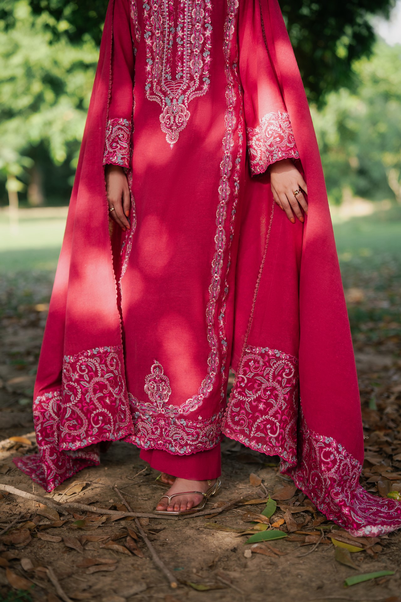 This elegant fuchsia pink dress is made from soft karandi fabric, perfect for the winter season. It features delicate embroidery on the neckline, sleeves, vertically down the body and borders. The flowy cut gives it a graceful look, making it ideal for daytime events, get-togethers, or festive evenings.