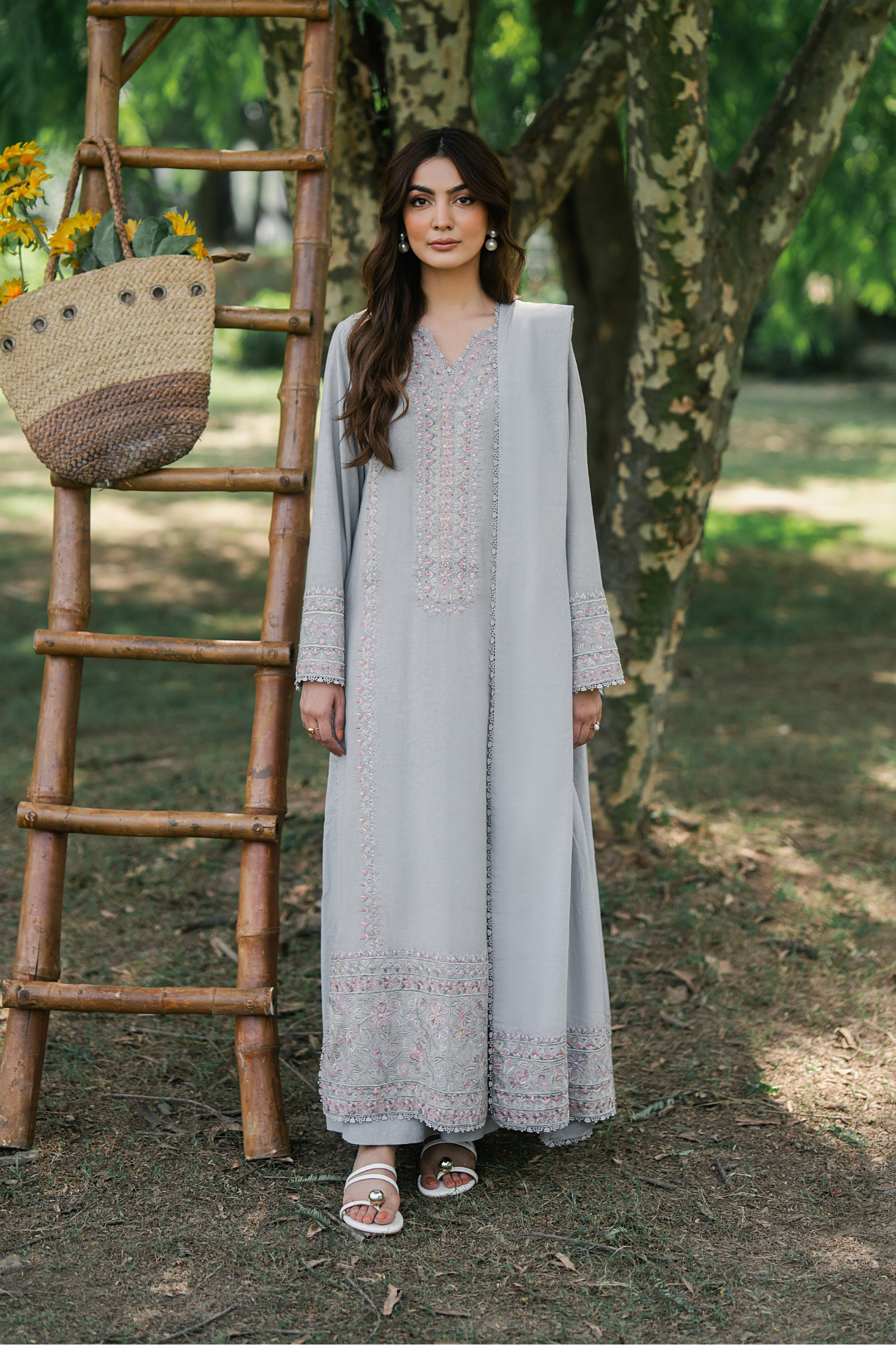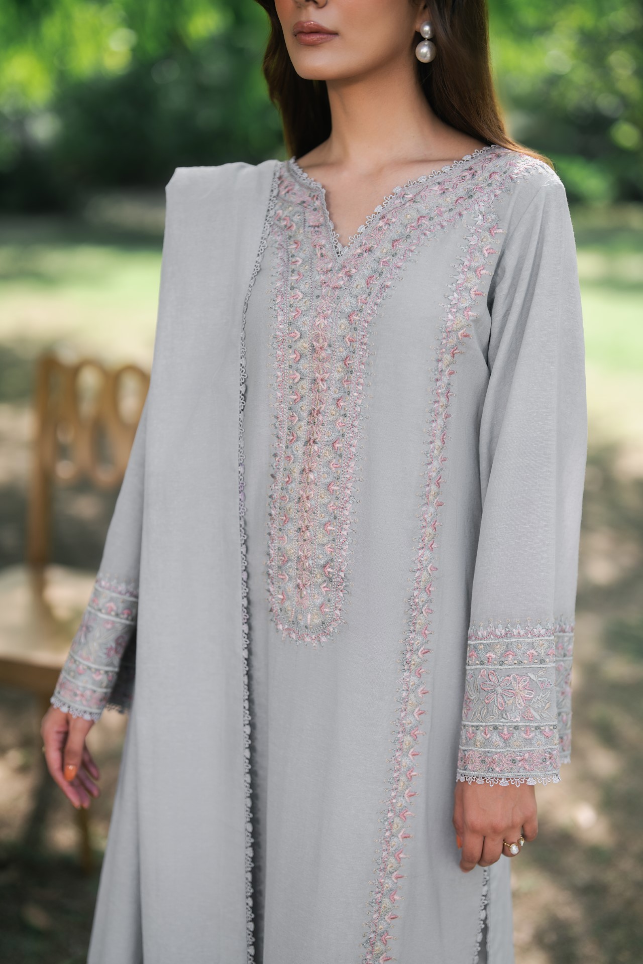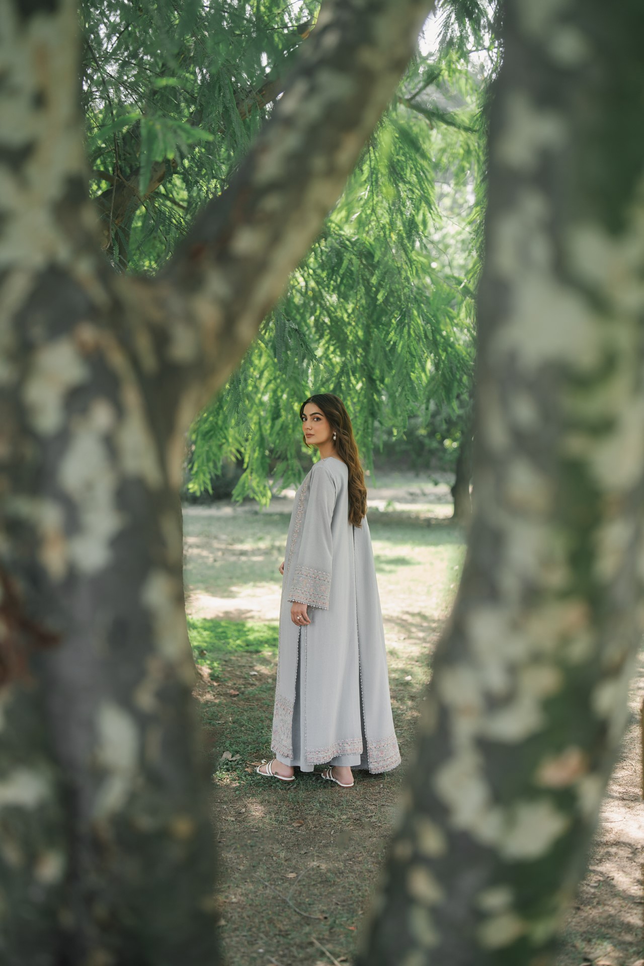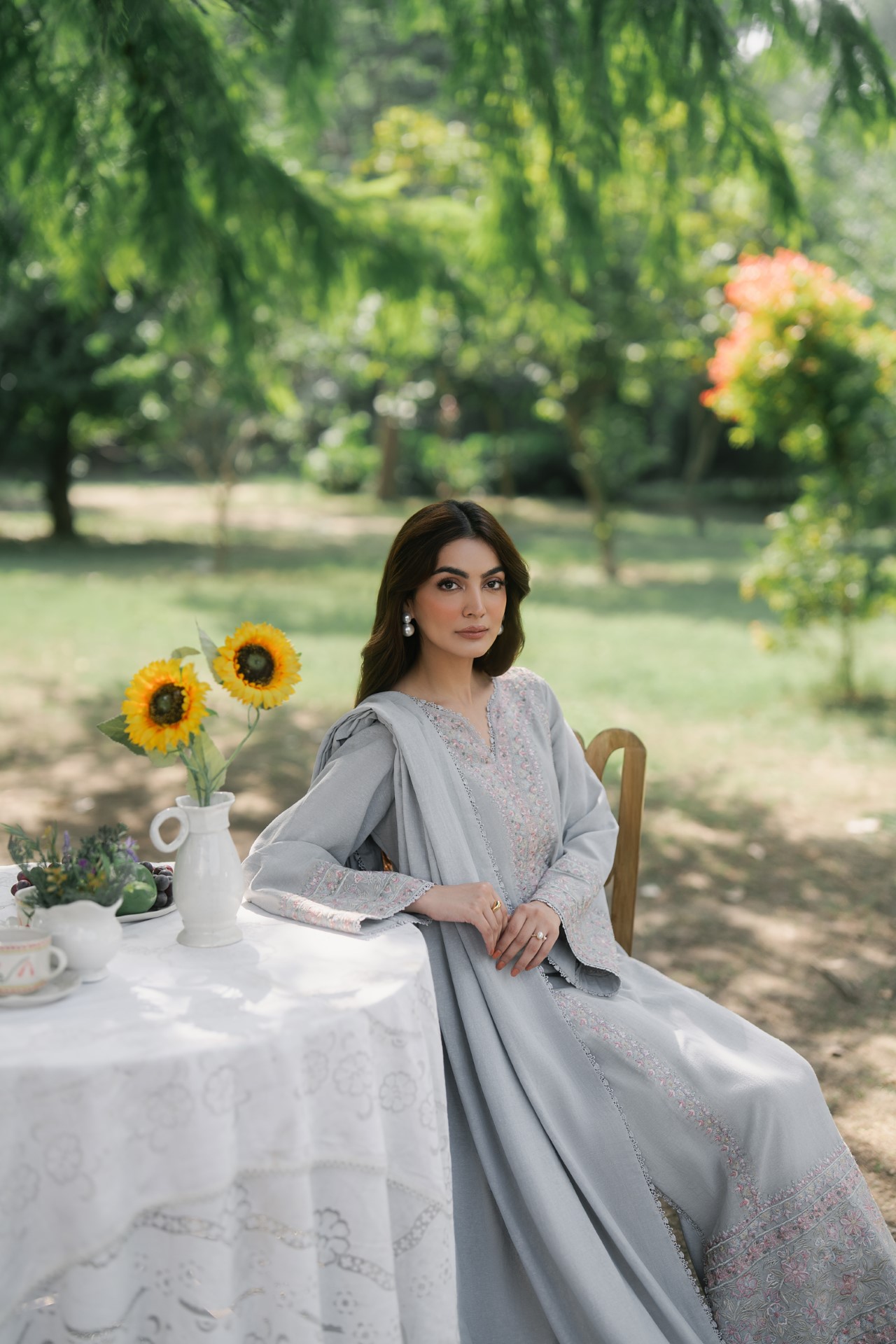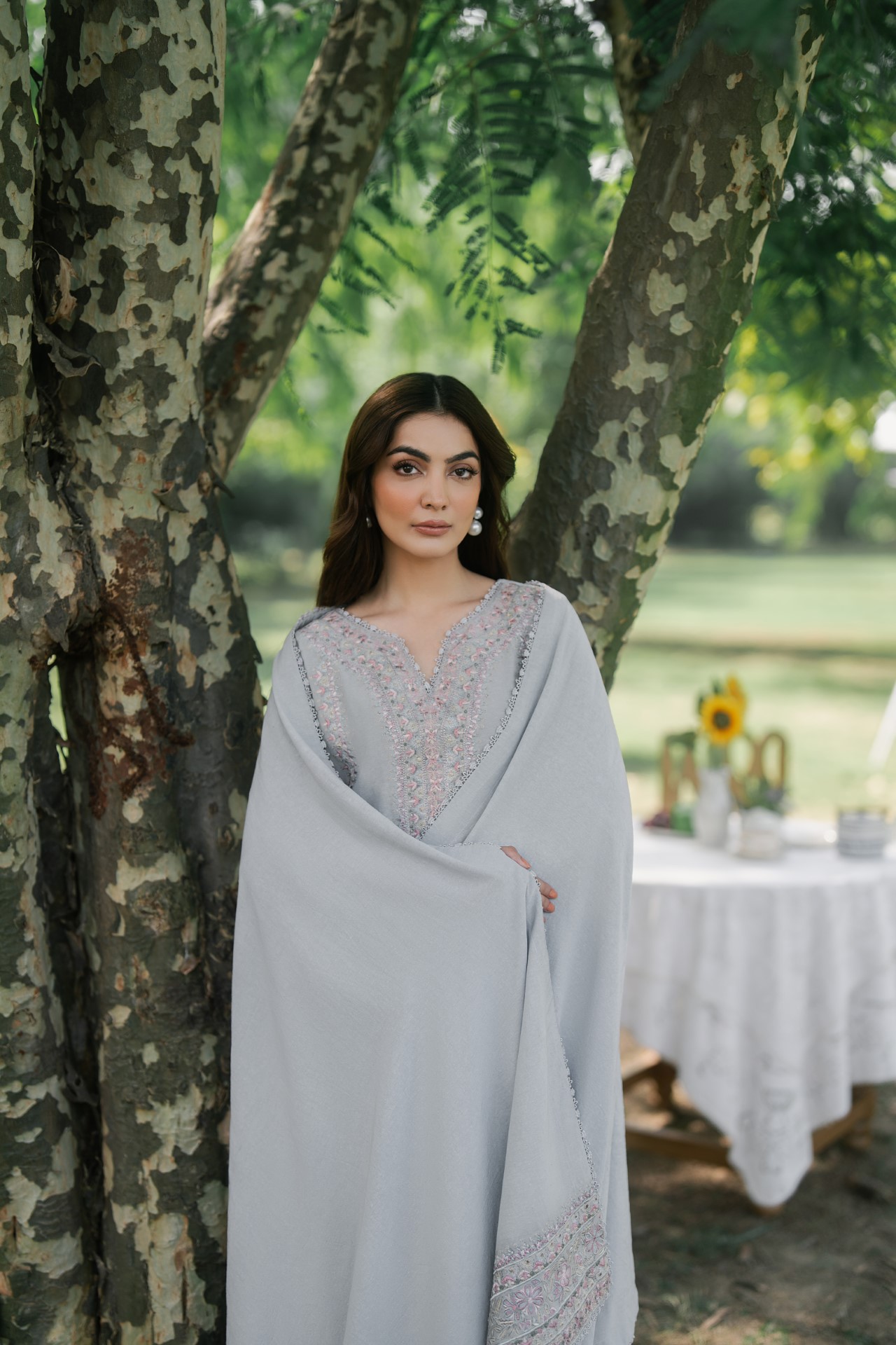 This minimal luxury outfit in a luminous grey hue gives a calm and graceful look. The delicate embroidery blends beautifully with the fabric, highlighted by a soft touch of pale pink woven into the floral motifs.