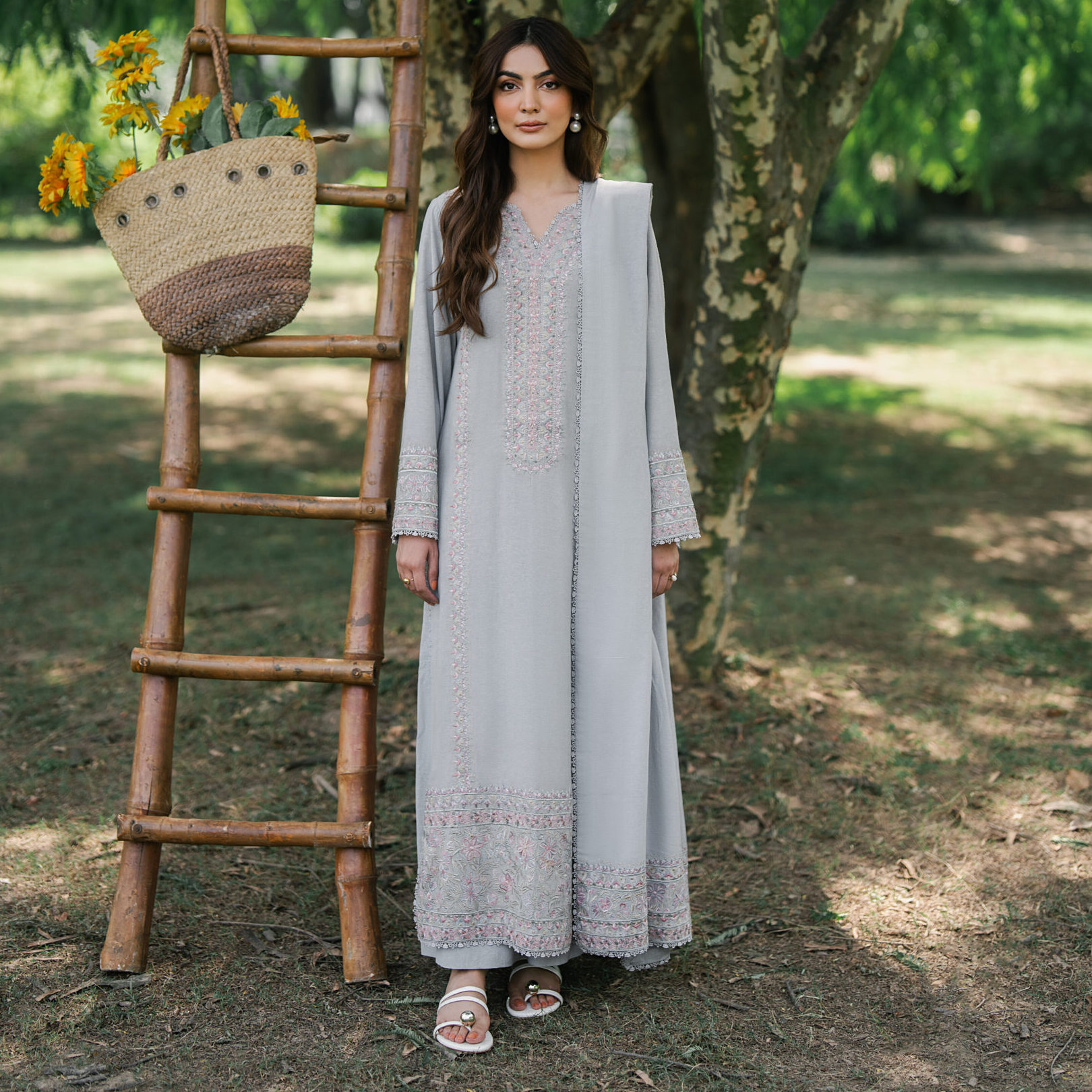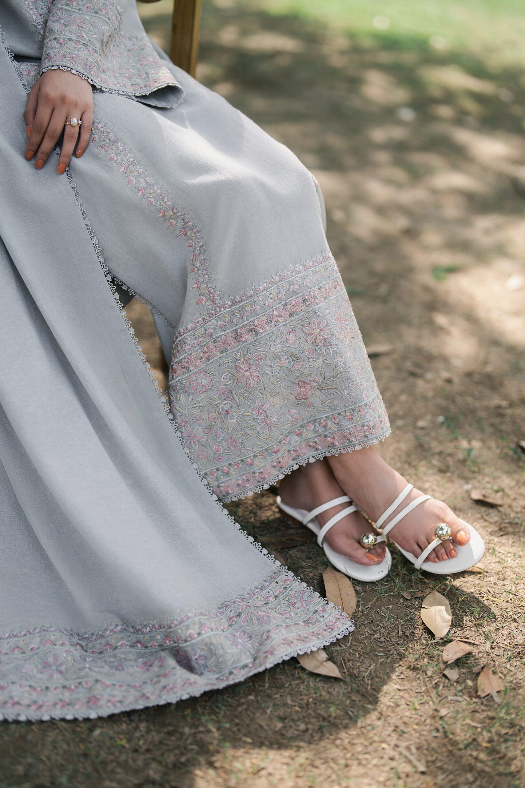 This minimal luxury outfit in a luminous grey hue gives a calm and graceful look. The delicate embroidery blends beautifully with the fabric, highlighted by a soft touch of pale pink woven into the floral motifs.