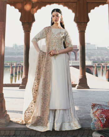 Wisteria – Make a lasting impression with this exquisite ensemble, featuring intricate handwork and luxurious fabrics. The shirt, crafted from Kundan Zari, is adorned with delicate embellishments, including silk thread, metallic thread embroidery, dabka accents, kingri beads, decorative stones, flat embellishment stones, metallic tubes, faceted glass beads, fine pipes, and star-shaped sequins. Paired with a regal jamawar sharara, the outfit exudes elegance and charm. The look is completed with a booti organza dupatta, beautifully designed with a four-sided border, adding a refined and timeless touch to the ensemble.