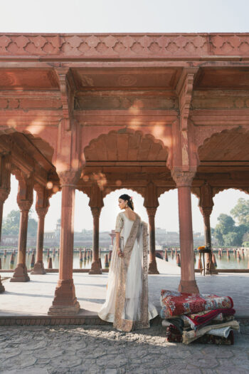 Wisteria – Make a lasting impression with this exquisite ensemble, featuring intricate handwork and luxurious fabrics. The shirt, crafted from Kundan Zari, is adorned with delicate embellishments, including silk thread, metallic thread embroidery, dabka accents, kingri beads, decorative stones, flat embellishment stones, metallic tubes, faceted glass beads, fine pipes, and star-shaped sequins. Paired with a regal jamawar sharara, the outfit exudes elegance and charm. The look is completed with a booti organza dupatta, beautifully designed with a four-sided border, adding a refined and timeless touch to the ensemble.