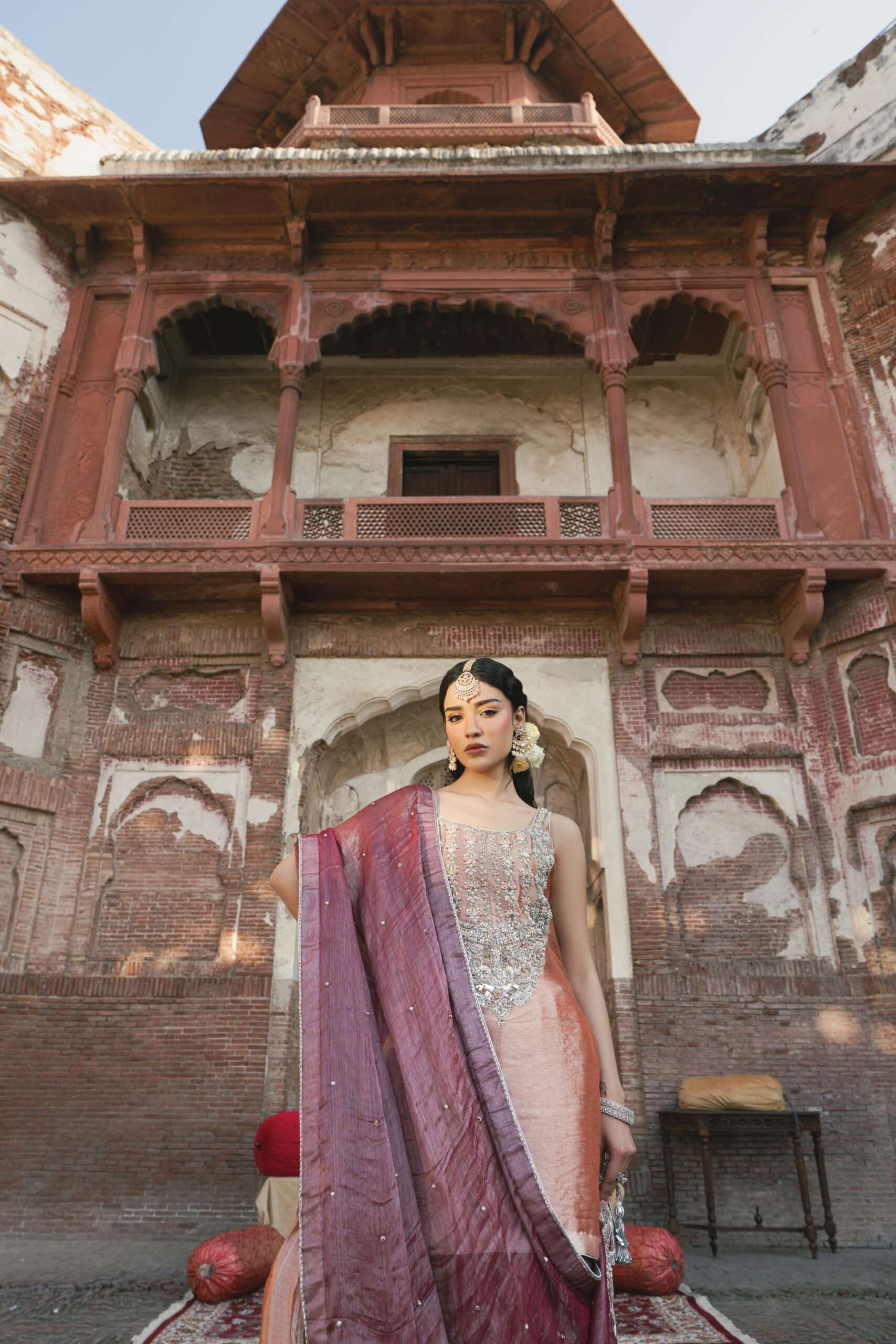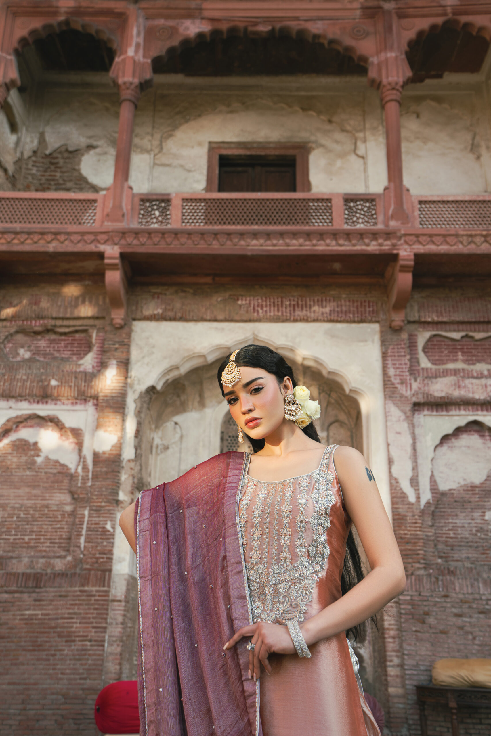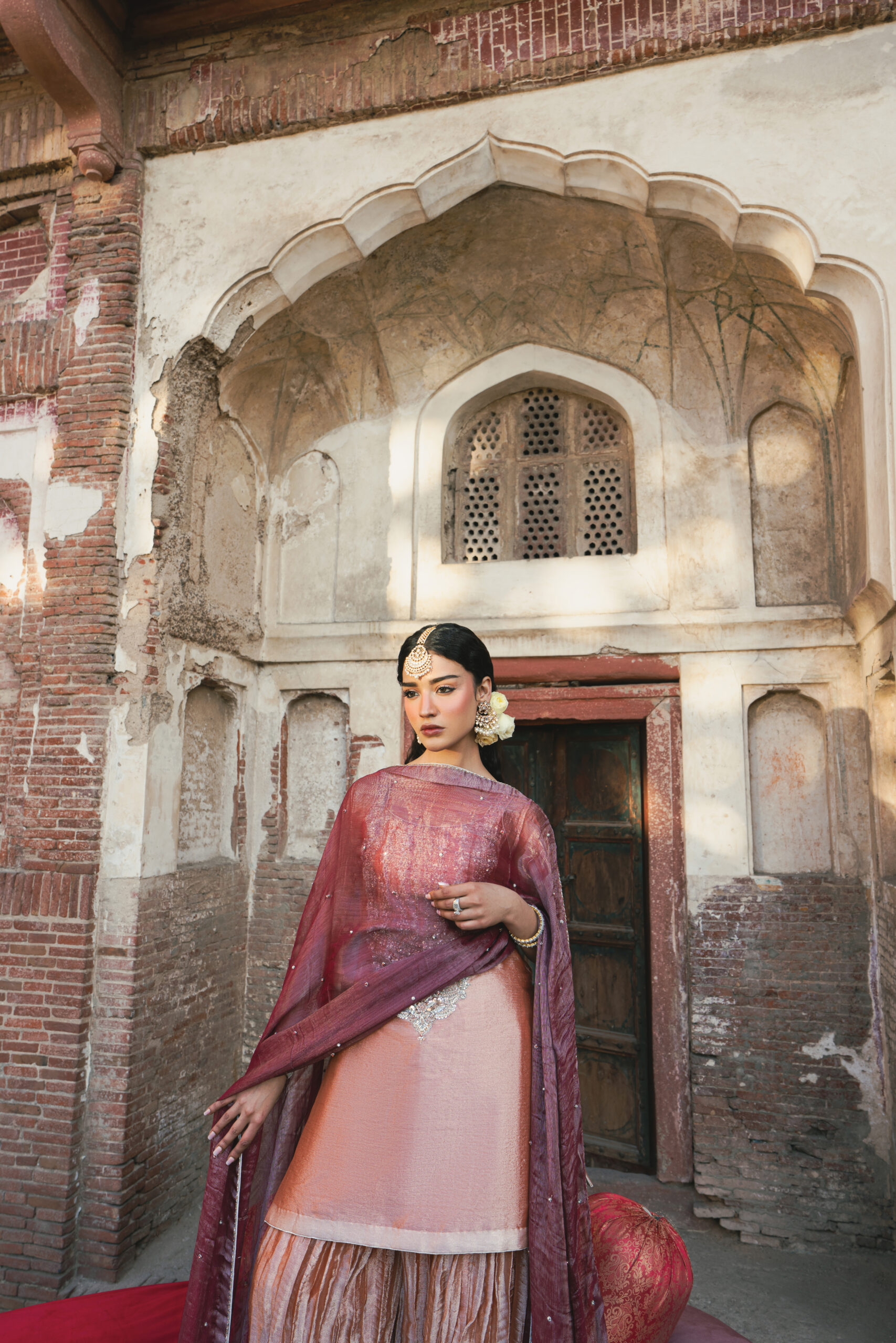 Zinnia – Elevate your style with our luxurious Karandi Tissue ensemble, adorned with intricate hand embellishments. The shirt features a stunning blend of decorative gemstones, beads, pearls, red ruby-like stones, and star-shaped sequins. These embellishments come together to create a design that radiates elegance and sophistication. Paired with a crushed sharara for a graceful silhouette, this ensemble is perfect for making a statement. The look is completed with a burgundy kundan zari dupatta, beautifully detailed with four-sided corner work and a delicate pearl spray, adding an opulent finishing touch.