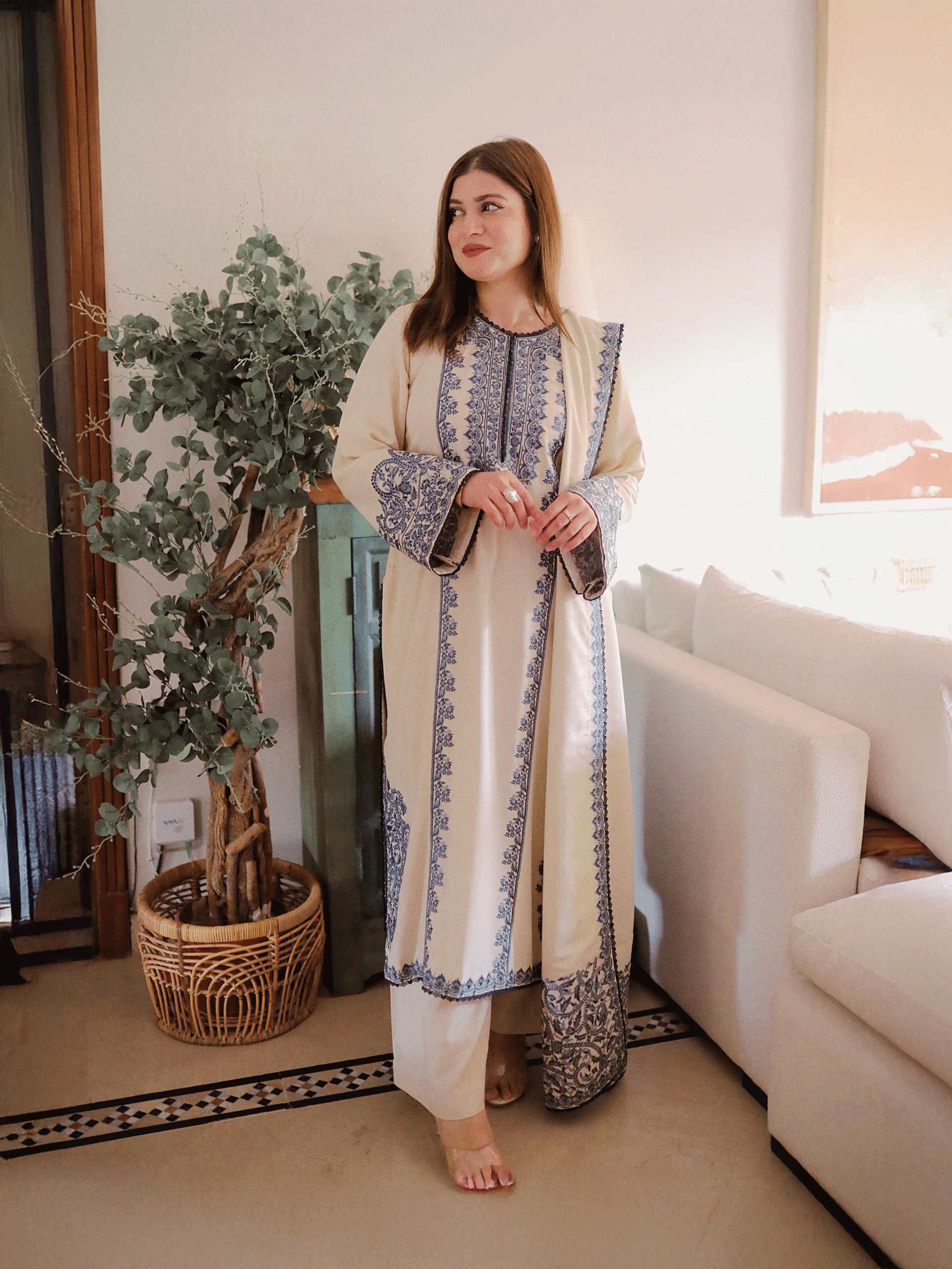 Paired with a shawl featuring a broad embroidered border, Grace became Urooj’s go-to for chilly days. This karandi suit captures everything we love about our women’s winter collection: comfort, sophistication, and carefully crafted details.
