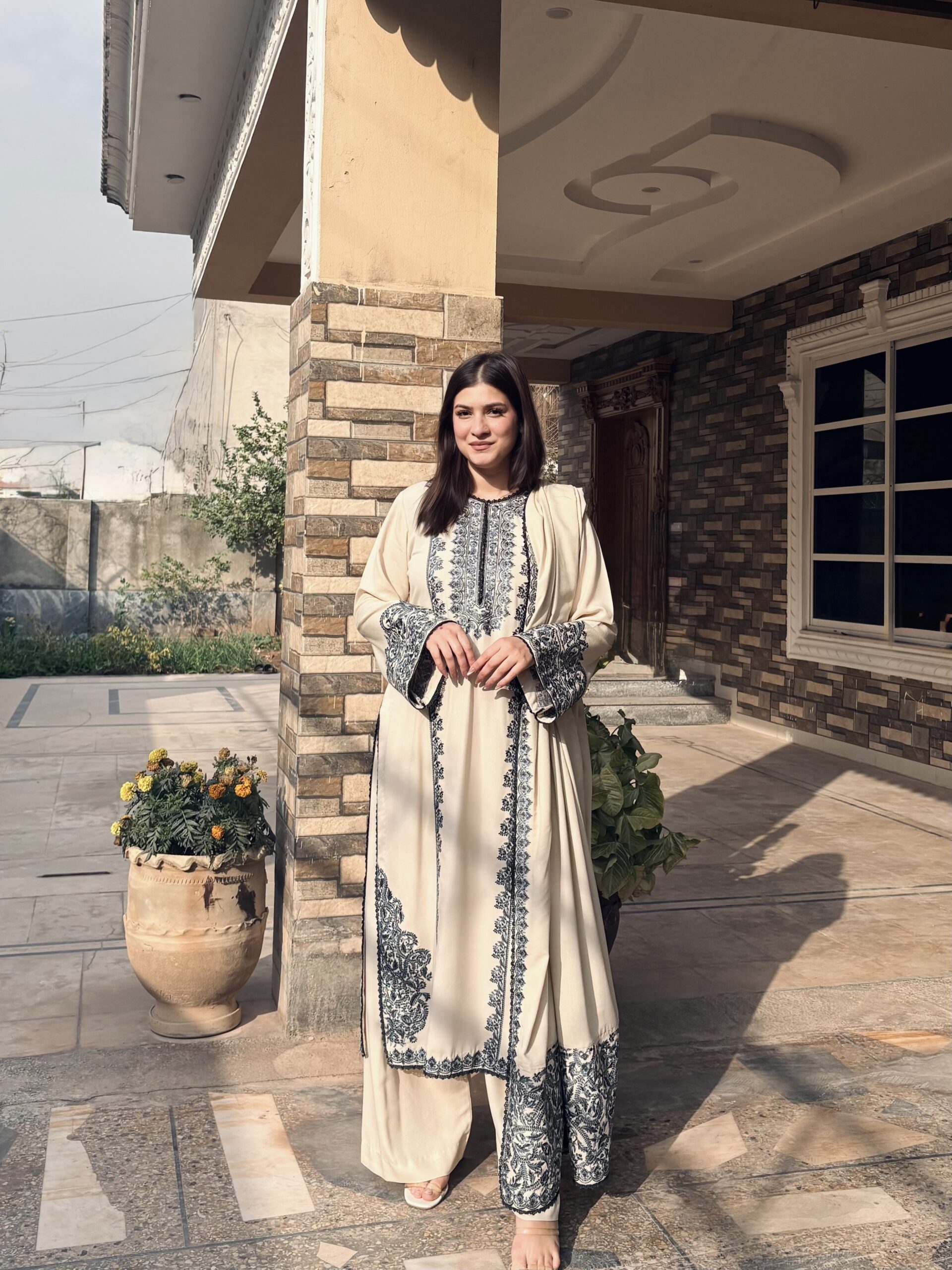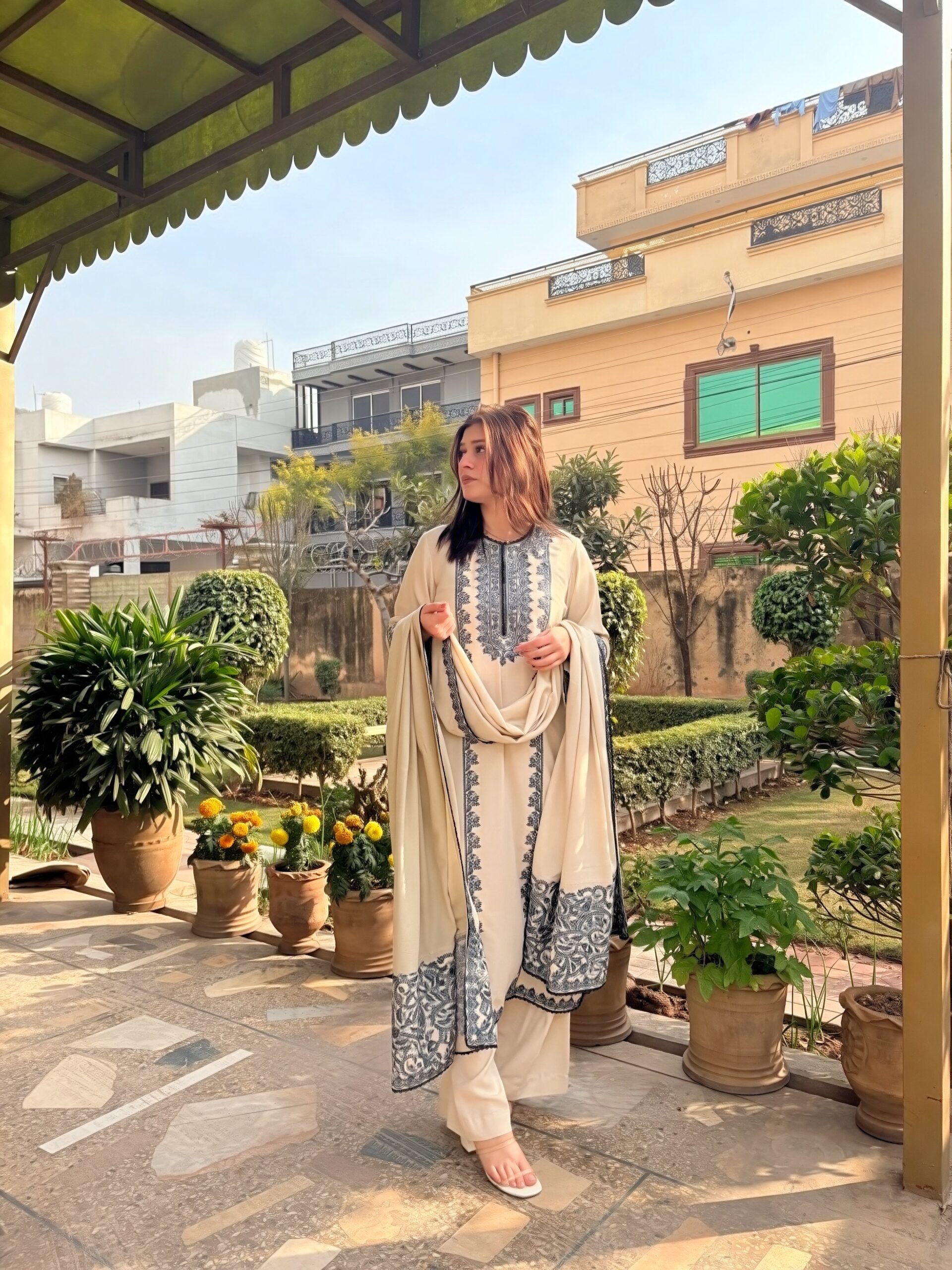 The first outfit she chose was Grace, an ivory karandi suit with striking navy blue embroidery. The intricate patterns along the neckline, front, back and hem make the outfit feel special and unique. The back-neck tassels added playful charm, while traditional motifs gave it a timeless, heirloom-inspired feel.